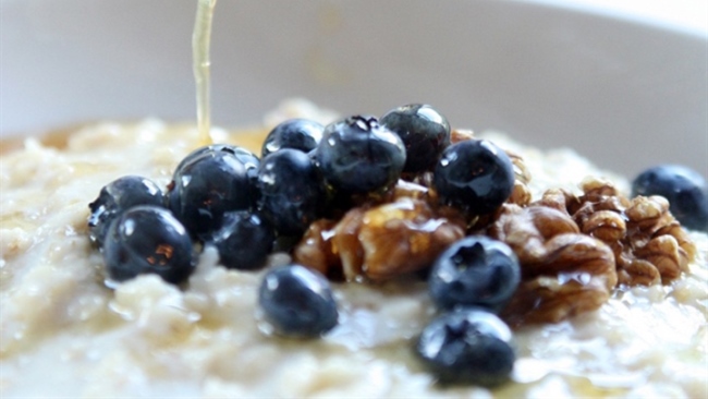 - Pour into two warmed bowls, sprinkle with the blueberries and nuts and drizzle over the honey.